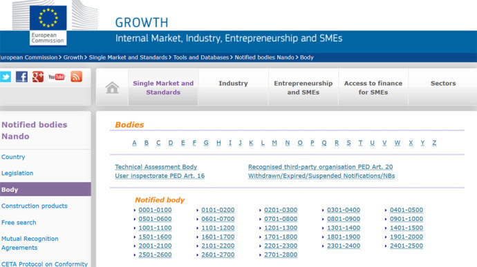 在歐盟官方網站-歐盟公告機構查詢官網https://ec.europa.eu/growth/tools-databases/nando/index.cfm,廠家可以查詢到目前從0001-2786兩千多家歐盟公告號機構詳細信息,每家機構對應的指令和法規授權以及發證機構信息都可在該網站查詢到。